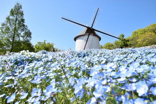 とくに「風車の丘」は、インスタ映えすると人気のエリアで、「バス・セーヌ エコミュゼ」の石造りの風車をイメージして建てられた風車と、ネモフィラや水仙など季節の花が咲く風景がとても絵になります。