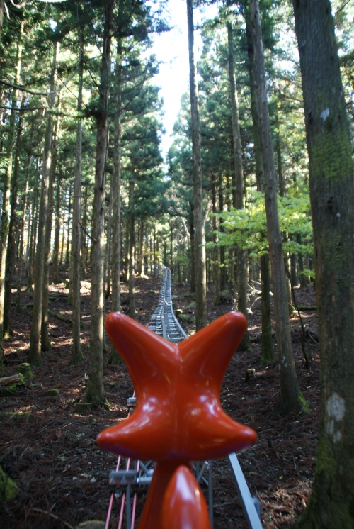 周回のコースは、森林の中を縫うように巡っており、レールの先が見えない程の急勾配の場所も。可愛いカブトムシ型の乗り物はゆっくりと走行するので、ジェットコースターのようなスリルはありませんが、登りはガタガタと山の中を登っていくワクワク感、下りはたまに開ける見晴らしとドキドキ感が味わえます。