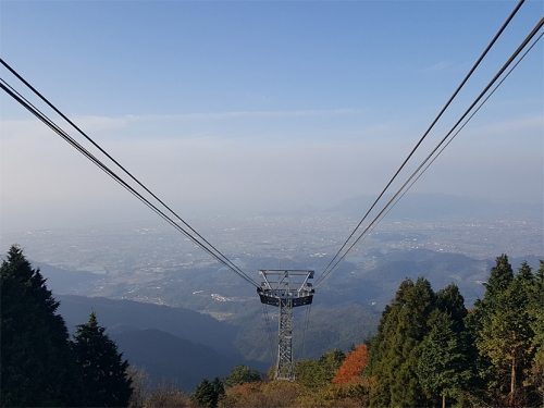 現在では、麓から日本最大級のロープウェイで山頂まで行くことができます。全長約2,600m、山麓駅から山頂駅の高低差約660mを毎秒10mというスピードで進み、乗車時間たったの7分!