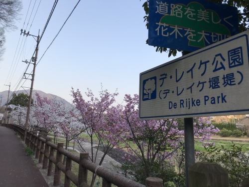 オデオン座から車で数分のところにあるデ・レイケ公園。明治時代に来日したオランダ人のヨハニス・デ・レイケが造った砂防ダムが脇町を流れる大谷川上流にあります。そのデ・レイケの功績を称え、平成21年4月に整備されたのがこのデ・レイケ公園です。オランダの象徴である風車が建てられているのが特徴です。