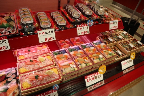 地下1Fのお弁当ストリートで、一際目を引く華やかな海鮮丼を販売している「創作鮨処 タキモト」。本来は巻き寿司が専門のお店のようで、海鮮丼以外にも、穴子一本巻きなどインパクトある見た目のお寿司も並んでいます。