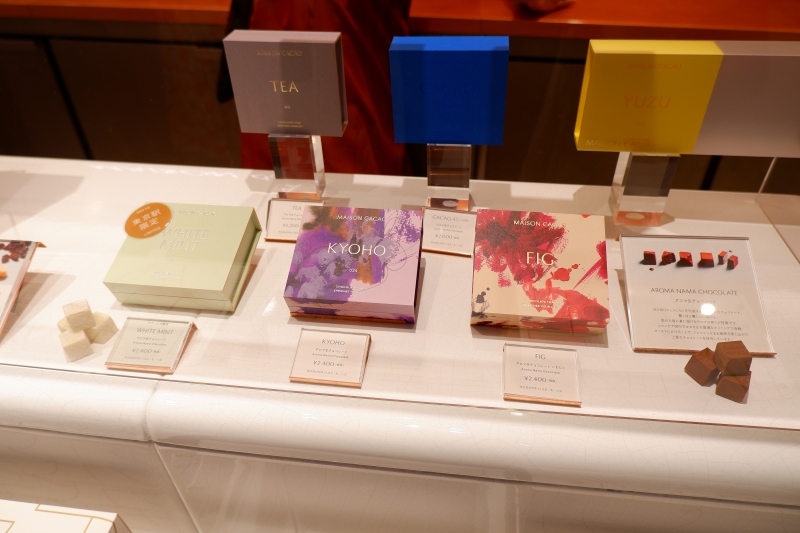 人気の生チョコレートは、アロマの風味を楽しめる「CACAO 45」(16粒入り・税込2,160円)をはじめ、オレンジピールが入った「サンセット」(16粒入り・税込2,160円)、さらに東京駅限定でホワイトミントが入った「アロマ生チョコレート」(16粒入り・税込2,592円)など、数十種類を提供。大切な人へのプレゼントにもおすすめです。