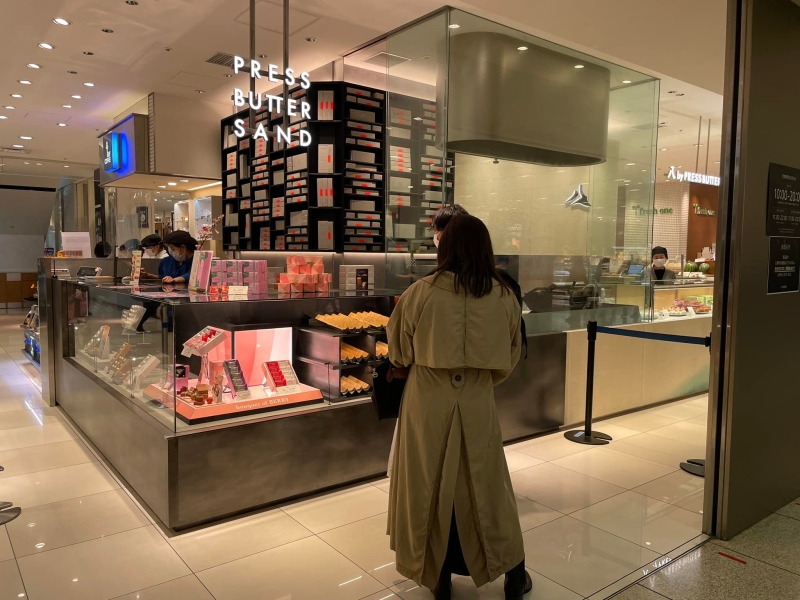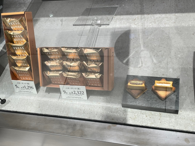 大丸東京店の地下1階にある「PRESS BUTTER SAND(プレスバターサンド)」。本来の風味を活かしたバター入りのクリームとキャラメルソースをサンドしたバターサンドが手に入るほか、焼き立てのバターサンドを味わえます。