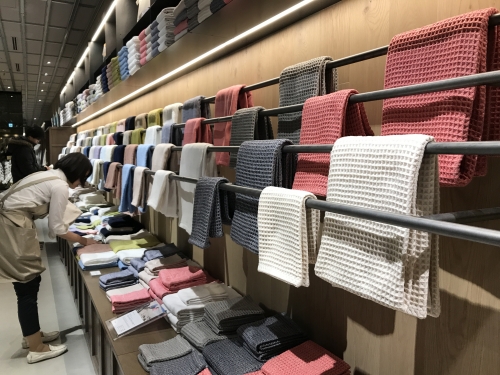 今治タオルは扱うコーナーも大きく、とても見やすいのが特徴。触り心地も確認できるので、自分用はもちろん、贈り物を選ぶ際にもこのシン・エヒメは重宝しそうです。