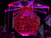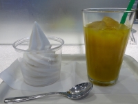 写真:旅田サトシ フルーツソフトクリーム(税込380円)とマンゴージュース(税込550円) |  写真:旅田サトシ コレド室町2 |  写真:旅田サトシ アートアクアリウムで展示されている金魚鉢 |