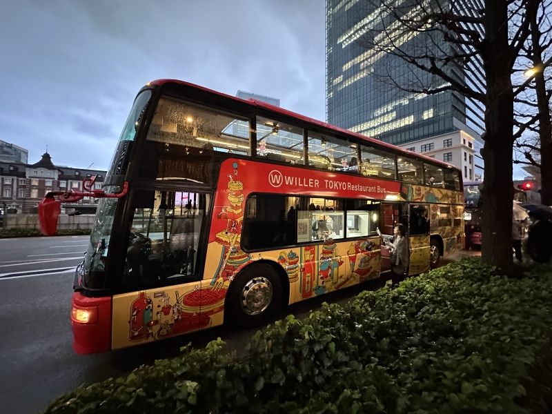 東京駅 丸の内ビル前でレストランバスに乗車します。とても目立つバスなのですぐにわかります。筆者は様々なコースがある中、川崎工場の夜景が楽しめるレストランバスに乗車してみました!