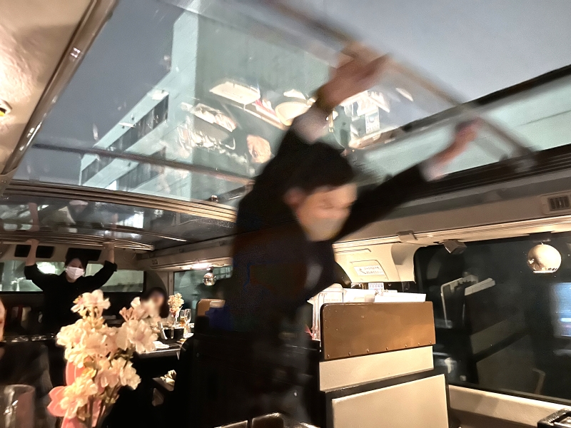 まずは、乗車して乾杯!席は対面式で、進行方向とは逆側の席でも、バスの揺れも少なく酔うこともありませんでした。テーブルには色々な形状の穴の開いたアクリル板があり、こちらにグラスを置くことによって、バスの揺れによるグラスの転倒が防げるようになっています。