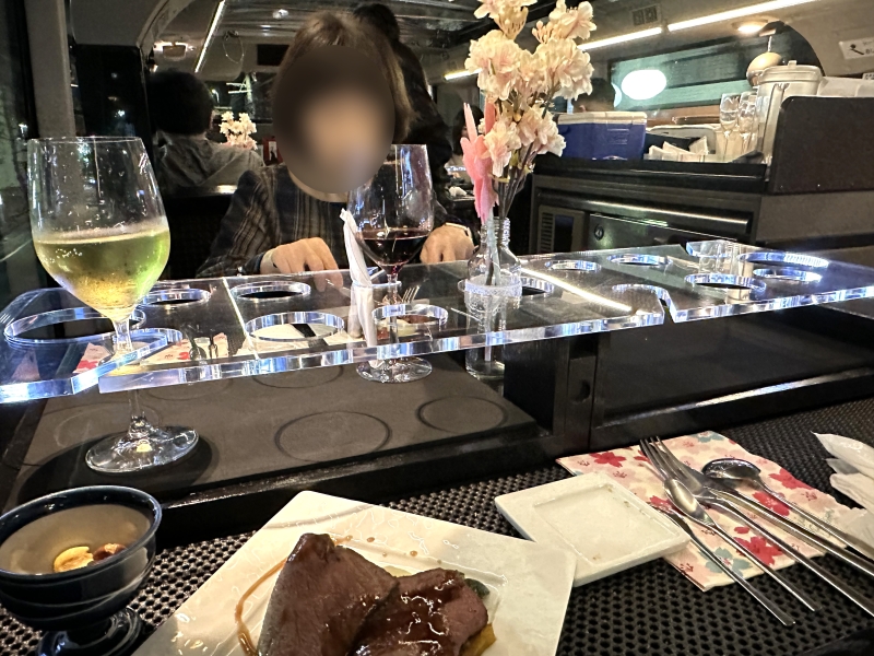 料理は、バスにいながらもコース料理を楽しめます。レストランバスの1階はキッチンになっていて、出来立ての温かい料理が楽しめるようになっています。アルコールやソフトドリンクも別料金で色々選べます。