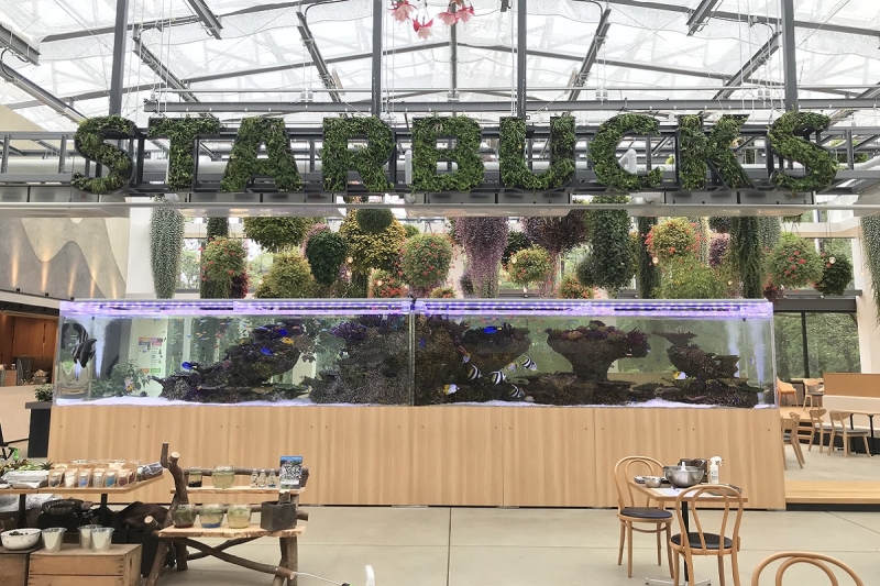 エンターテイメント型フラワーパーク「HANA・BIYORI」の中にあるスターバックス。店内は2方面が大きな窓となっているため、とても明るく広々と感じるだけでなく、天井にはフラワーシャンデリアがあり、どの席からも花を楽しみながら過ごせます。