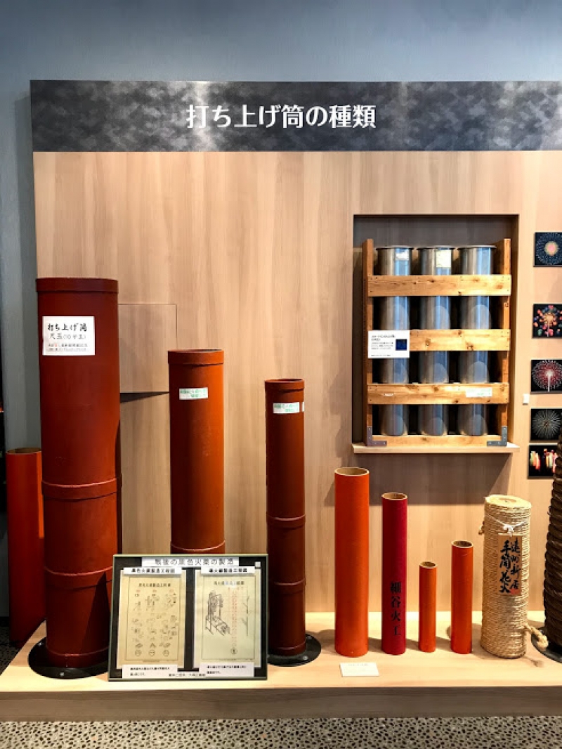 小さな展示室ですが、そこには普段なかなか見ることのできない、打ち上げ花火に関する資料がずらりと並んでいます。花火を打ち上げるときに実際に使われている打ち上げ筒や、花火玉の原寸大模型、さらには花火の仕組みが分かるように半分に切った花火玉模型など、どれも興味深いものばかり!