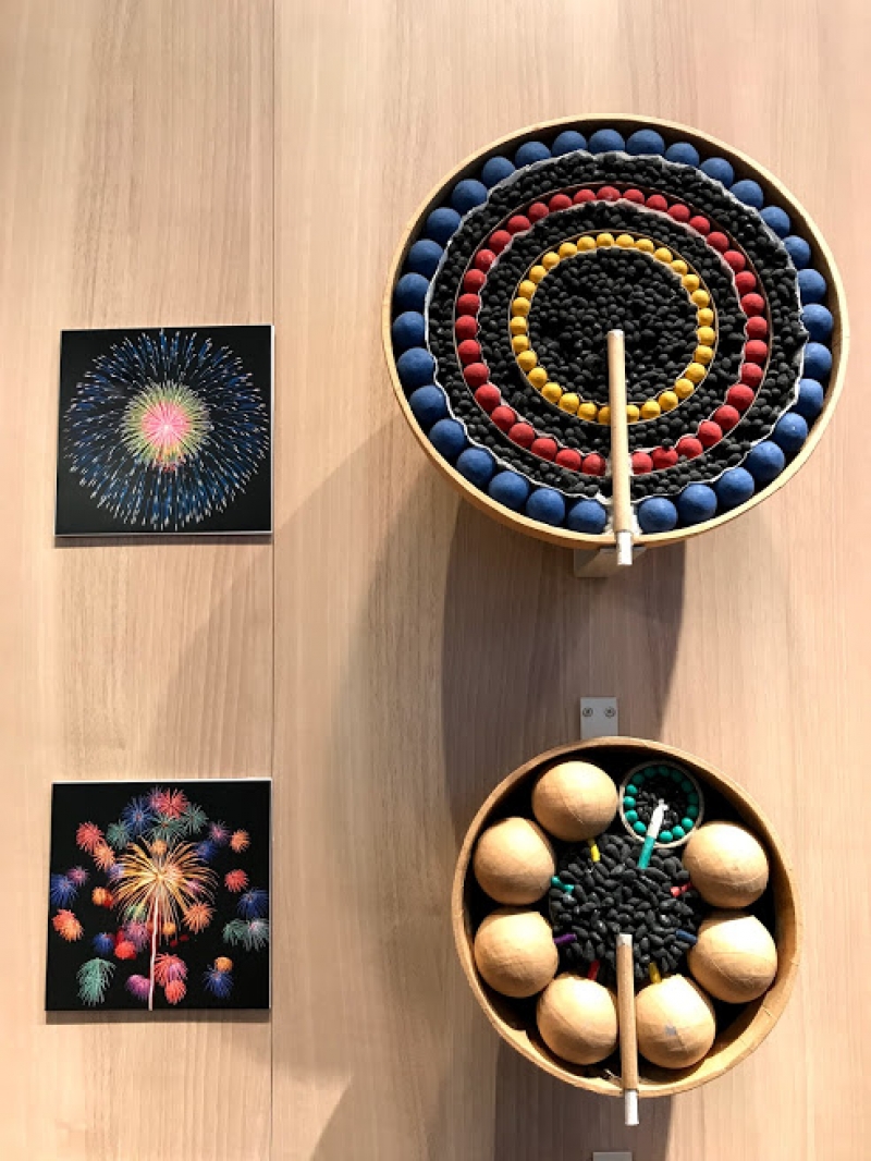 花火玉の断面模型の横には、実際に打ち上げた時の花火の写真が紹介されています。夜空に上がるとどうしてあんなにきれいに花開くのか、とっても不思議ですよね!