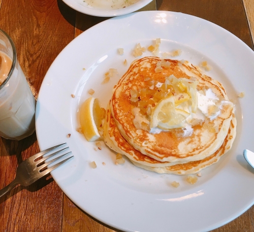 ランチメニューでは、定番の「ラザニアパンケーキ」やチキンとソーセージがついているものなどがお得ですが、「レモンリコッタパンケーキ」なども、ちょっと甘めなランチの気分の時におすすめです。