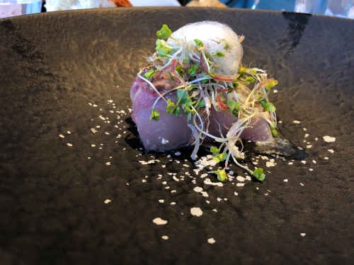 市場は移転したとはいえ、築地らしく魚類の定食が評判のこちらのお店。今回は炭火で焼かれた銀鮭照焼定食にマグロのブツ切りを付けて頂きます。パリパリで香ばしい皮とふっくらな身は完璧な焼き加減の証拠。ご飯、味噌汁がお代わり自由な点も嬉しいです。