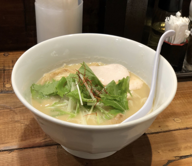 学芸大学の「武一」で修行された女性店主による白湯ラーメンのお店です。お店一押しの「濃厚鶏そば(塩)」を紹介します。濃厚な旨味を感じるスープは、バランスの整ったあっさりめのものです。