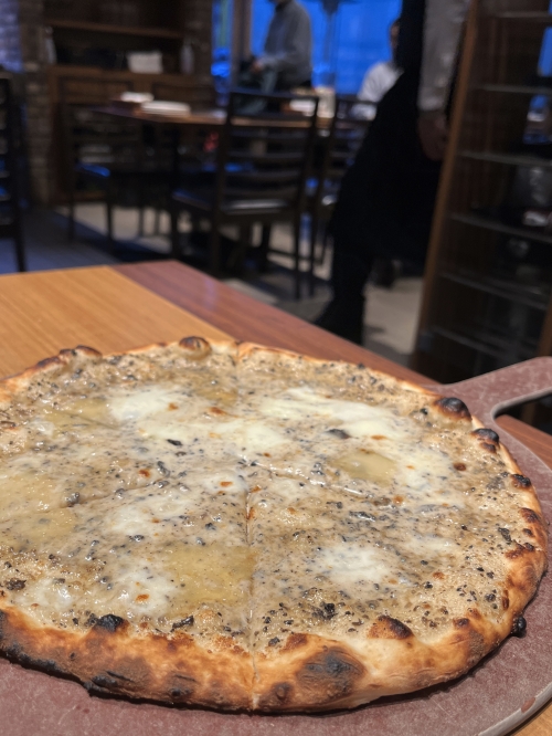 本場ニューヨーク店のレシピそのままという窯焼きピッツァは、大きくて薄くて軽い口当たり。とろけるフォンティーナチーズと華やかな香りの黒トリュフがよく合う一品です。