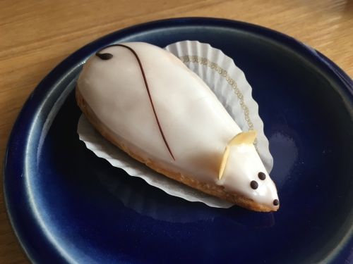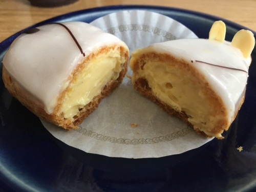 アーモンドで耳を表現し、甘さも程よいアイシングを施した体に、チョコで描かれた尻尾と目は、何とも愛くるしい形をしています。薄く、柔らかなシュー皮と、たっぷりと中に詰まった、さっぱりしながらも味わいのあるカスタードとの相性も抜群です。口に無理なく入る小さなサイズ感も、上品に食べ易く、バランスの良いシュークリームと言えるでしょう。