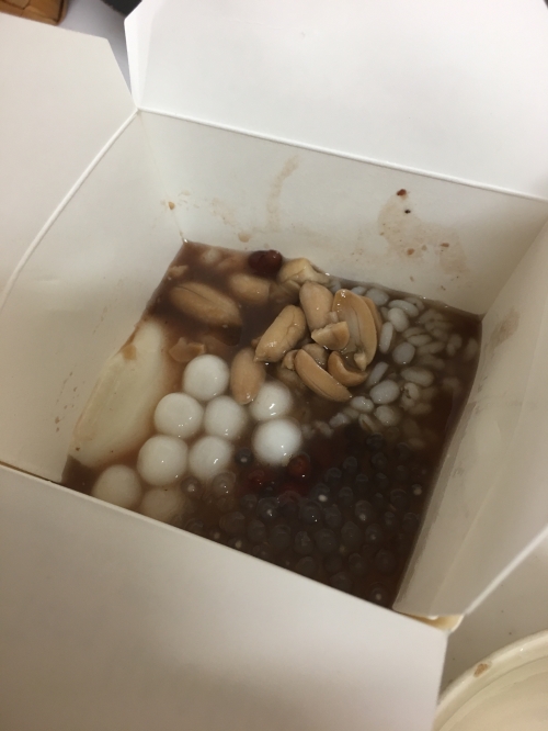 最後に10種類以上の中からトッピングを選びます。1つ100円帯と150円帯のトッピングがあり、小豆、緑豆、キクラゲ、ハトムギ(以上100円帯)のほか、ピーナッツ、さつまいも団子、黒もち米(以上150円帯)など多様です。