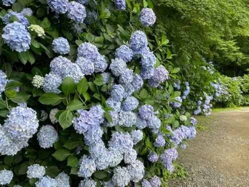 道の両脇に青い紫陽花が咲き乱れる「あじさいの小径」や、その奥にある「あじさい坂(階段)」は、特にフォトスポットとして人気!