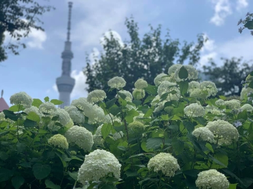 色とりどりの紫陽花が種類豊富に咲いていて、浅草らしい景色や東京スカイツリーとのコラボショットも楽しめます。