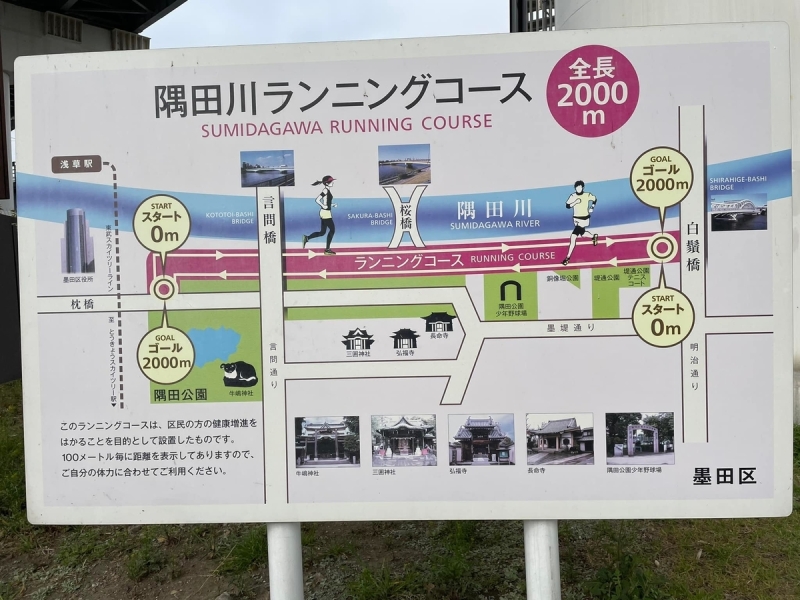 コースには100m毎に距離表示が設けられていて、長閑に流れる隅田川や浅草の街並みをはじめ、スカイツリーや言問橋、桜橋や白髭橋などの橋を見ながら走ることができます。