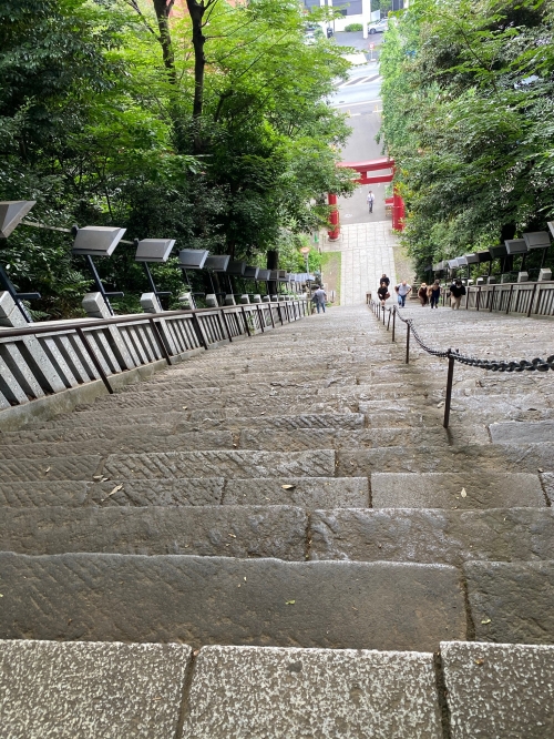 正面の「出世の階段」を男坂、右側の緩やかな階段を女坂とも呼んでいます。男坂は、かなり急なので、上り下りには気をつけましょう。社殿手前には、徳川家光将軍に献上された将軍梅や、石を撫でると福が身につくと言われる招き石があります。