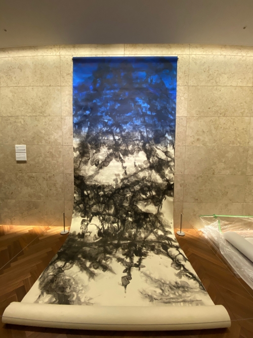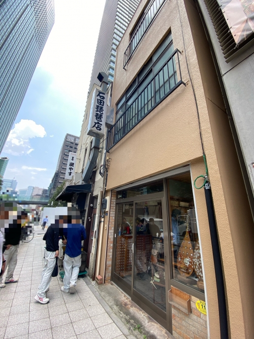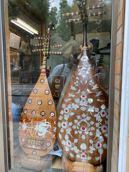 1878年創業、国内唯一の琵琶専門店が、虎ノ門ヒルズの道路を挟んだ場所にあります。店頭のショーケースには、人間国宝で四代目店主の石田不識さんが作成した、正倉院に収蔵されている琵琶のレプリカが展示されています。