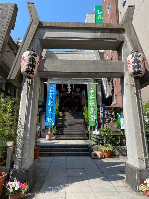 大都会らしく、高層オフィスビルと社務所や神楽殿などが一体化した神社。海上守護や商売繁盛などの運を掌るパワースポットとされ、近隣の海運会社、銀行、証券会社などのビジネスマンが多く参拝しています。