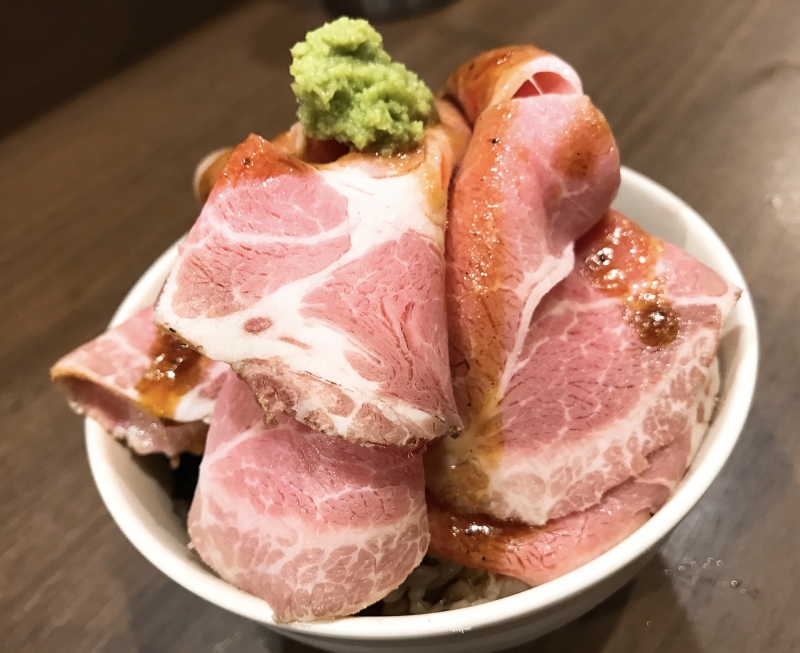 そして何よりおすすめなのが、チャーシュー丼。サイドメニューとは思えないボリュームです。炙られたコロチャーの上にローストポークが君臨、わさびも効いてジューシーなお肉との相性抜群です。