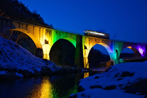 宮沢賢治の名作『銀河鉄道の夜』のモチーフになったとも言われる橋。JR釜石線の鉄道用の橋で、正式名称を「宮守川橋梁」と言います。長さ107.3m、高さ17.8mで、20mの間隔で半円が5つ連なるアーチ橋です。日没から22時まではLEDでライトアップされ幻想的。令和2年7月22日には、一般社団法人夜景観光コンベンション・ビューローから「日本夜景遺産(ライトアップ夜景遺産)」に認定されました。