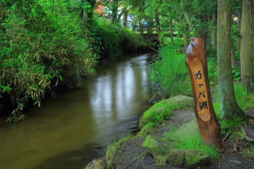 うっそうとした茂みに覆われ、澄みきった水が流れる川辺を見ると、今にも河童が現れそう。淵のそばには、なんと河童釣り用の釣竿が置いてあり、自由に使うことができます。