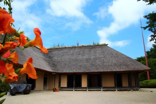 本殿前には広大な芝生が広がり、こちらも魅力。これは1661年(寛文元年)青森県八戸から遠野に村替えした南部直栄が造営したもので、一周450m、最大幅50mという広大な芝生の馬場になっています。