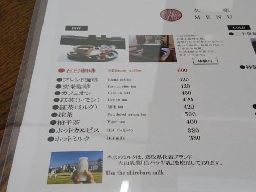 種類豊富なドリンクメニューのなかでも、一番注目されているドリンクは石臼珈琲(600円)です。鳥取の石工が産んだ石臼で挽いた珈琲で、実際に石臼を使って珈琲を挽く体験もでき、多くの観光客の方が注文する人気メニューです。