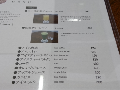 ブレンド珈琲(420円)や玄米珈琲(420円)、アイス珈琲(420)や紅茶(420円)のほか、オレンジジュース(400円)やコーラ(400円)、カルピス(380円)など、子供でも飲めるメニューもあります。