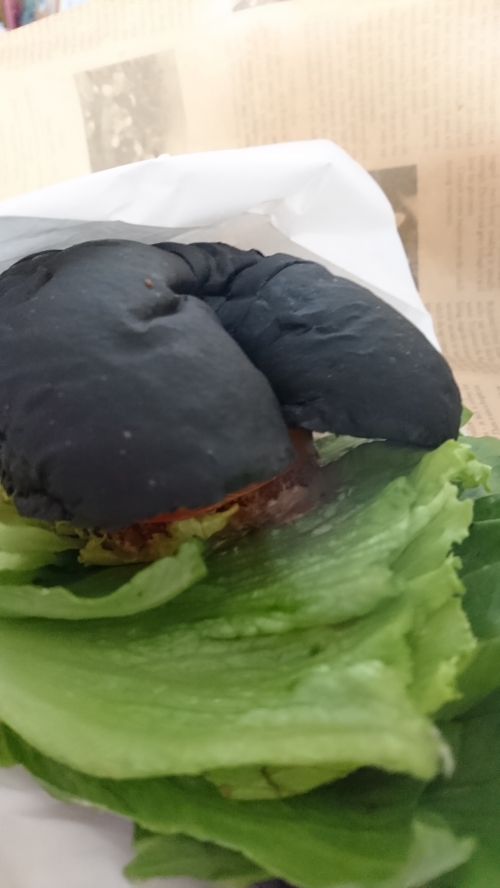 道の駅内にある「白うさぎの台所」で食べることができる、真っ黒な見た目が衝撃的な、もさバーガー!