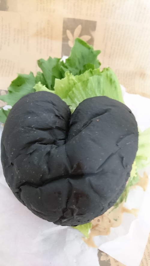 真黒なバンズの正体は、地元の特産である白イカのイカスミ!更に「恋人の聖地」や「恋愛成就のパワースポット」であることから、そのバンズは可愛らしいハート型♪