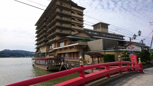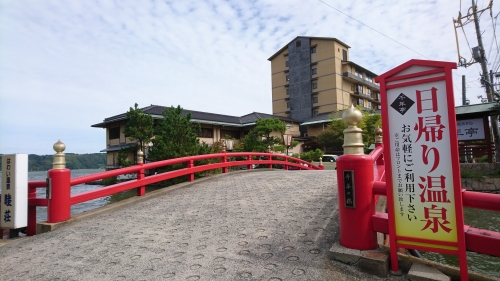 弁財天の湯は、東郷湖観光ホテル千年亭の橋を渡るすぐ前にあります。