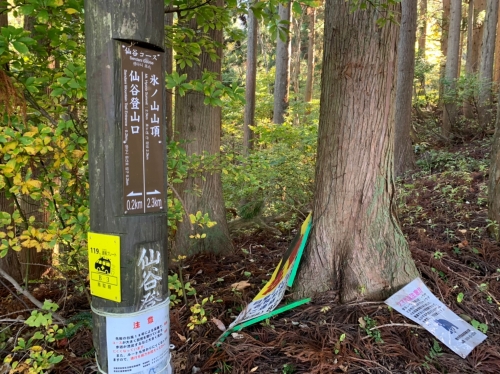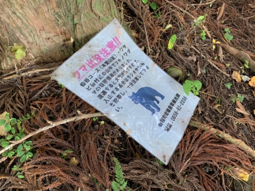 ほどなくして杉林に到着し、ここから本格的な登山道へと変わっていきます。山頂を示す道標と共に、クマ出没の貼り紙や注意の看板が置かれています。