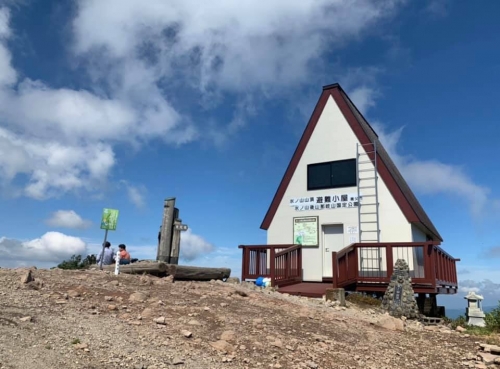 丸太の道を進み、木の板で作られた道の先にはもう山頂小屋が目の前です。