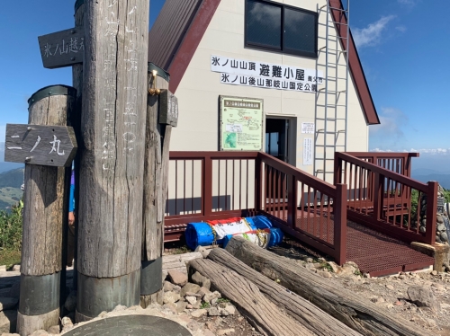 中央には氷ノ山越あたりからずっと小さく見えていた三角屋根の可愛らしい山頂避難小屋があり、三ノ丸コース方面にはお手洗いもあります。