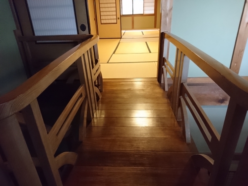 2つの階段のうち、1つは洋風の螺旋階段で、吹き抜け空間を太鼓橋で渡らせている珍しい造りをしています。