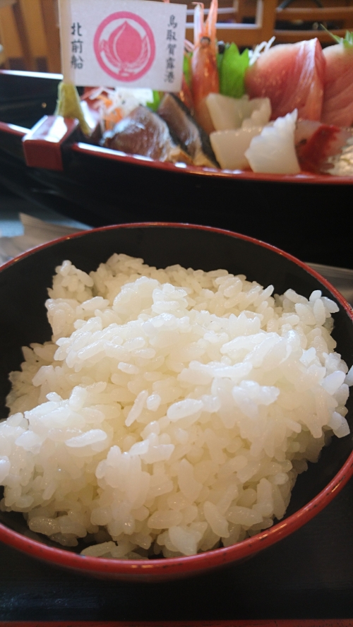 素晴らしいコスパだらけで、ご紹介が遅れましたが、なんと、ご飯はお代わり自由です!新鮮なお刺身に合うホクホクご飯は鳥取県産という嬉しさです。