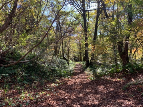駐車場の奥から散策道へと入っていくと、車通りの多い道路からすぐの場所にも関わらず、どんどん木々に囲まれていき、別世界のような光景が広がります。