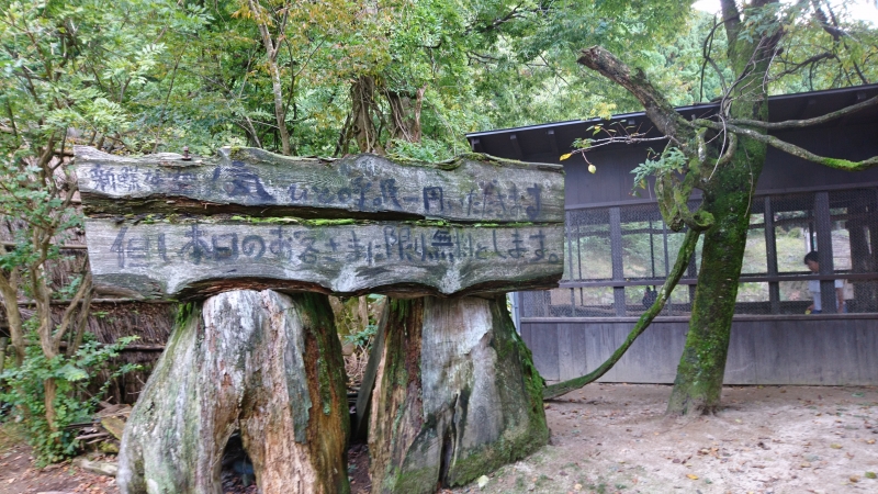 みたき園に到着し、車を駐車して降りると、すぐ目に飛び込んでくる看板が1つあります。歴史を感じさせる看板は字が薄くなっており読みづらいですが「新鮮な空気 ひと呼吸一円いただきます」と書かれています。