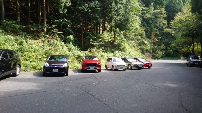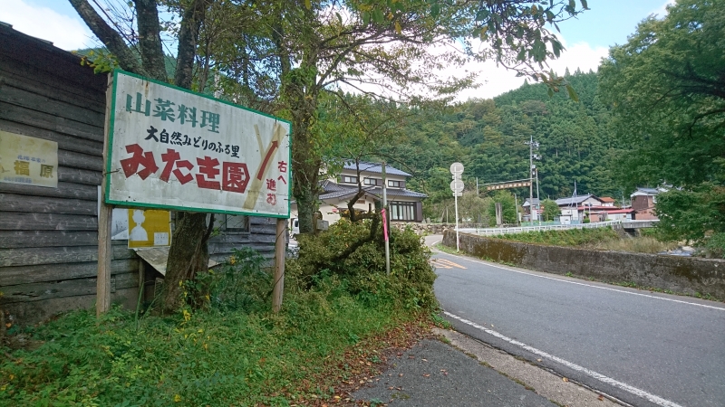 橋を渡り、周囲に民家もなくなった山峡へと進んでいくと、みたき園の駐車場が見えてきます。