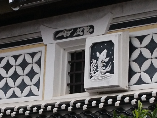 住宅や蔵には、青や黄色を用いたカラフルな色が使われ、その模様に取り囲まれるように先ほどご紹介した鯉や亀、打出の小槌などの縁起のいい鏝絵が描かれています。