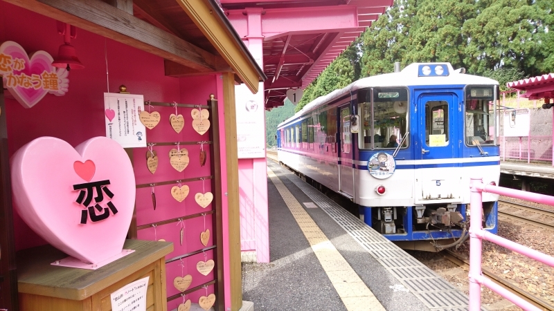 1番線ホーム乗り場の入り口のすぐ横には、恋のお願いを叶えてくれる「ハートの絵馬」や、ピンク色の「恋がかなう鐘」があるので、ぜひ恋愛成就を願ってみて下さいね♪