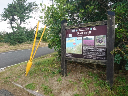 らっきょう畑の入り口前には看板も出ており、坂を上っていけば、そこはもう赤紫色の花が咲き誇るらっきょう畑です。