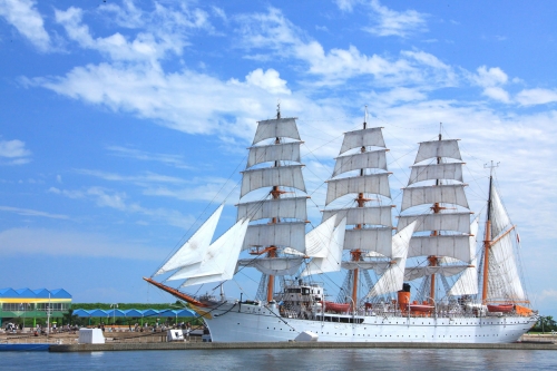 帆船海王丸を中心とした、海沿いに広がる憩いの公園
