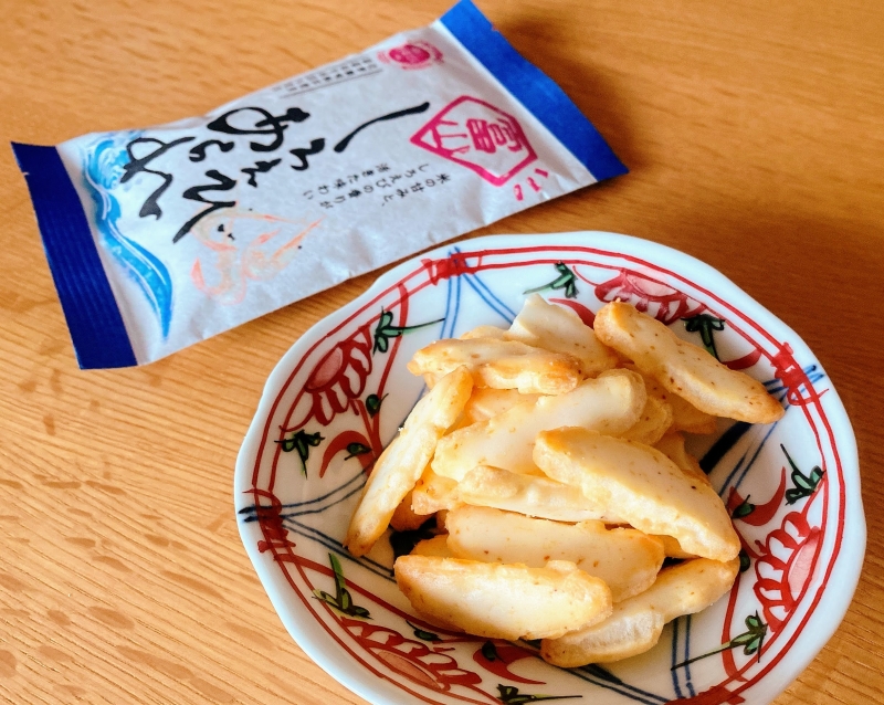 生地に白エビを練り込んで、香ばしく焼いたおせんべい。大きいサイズの柿の種のような形状で、白エビの繊細な風味を生かしたあられです。小袋で販売しているので、バラマキ土産にもおすすめ。