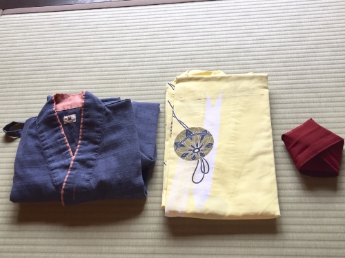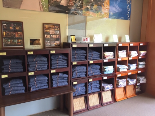チェックイン後にお部屋へ向かう前に、ロビーの浴衣&作務衣コーナーで、浴衣と作務衣を1人1着ずつ選びます。どちらも着た状態で館内を歩けますが、筆者が宿泊した日は、作務衣を着ている人が多かったです。